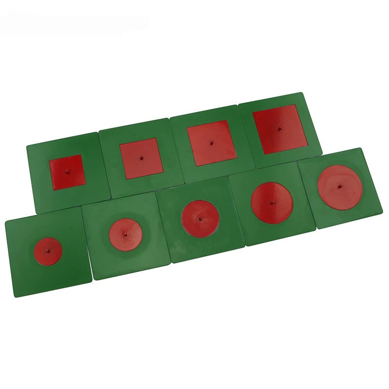 The material consists of 9 green metal frames with bottoms and red insets with 1 set of 5 circles decreasing in diameter and 1 set of 4 squares decreasing in length and width.