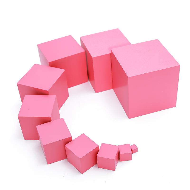 【Description】:10 pink wooden cubes ranging from 1cm3 to 10cm3, differing in 3 dimensions. The cubes increase progressively in the algebraic series of the third power. Therefore, the second cube equals 8 of the first; the third cube equals 27 of the first etc…