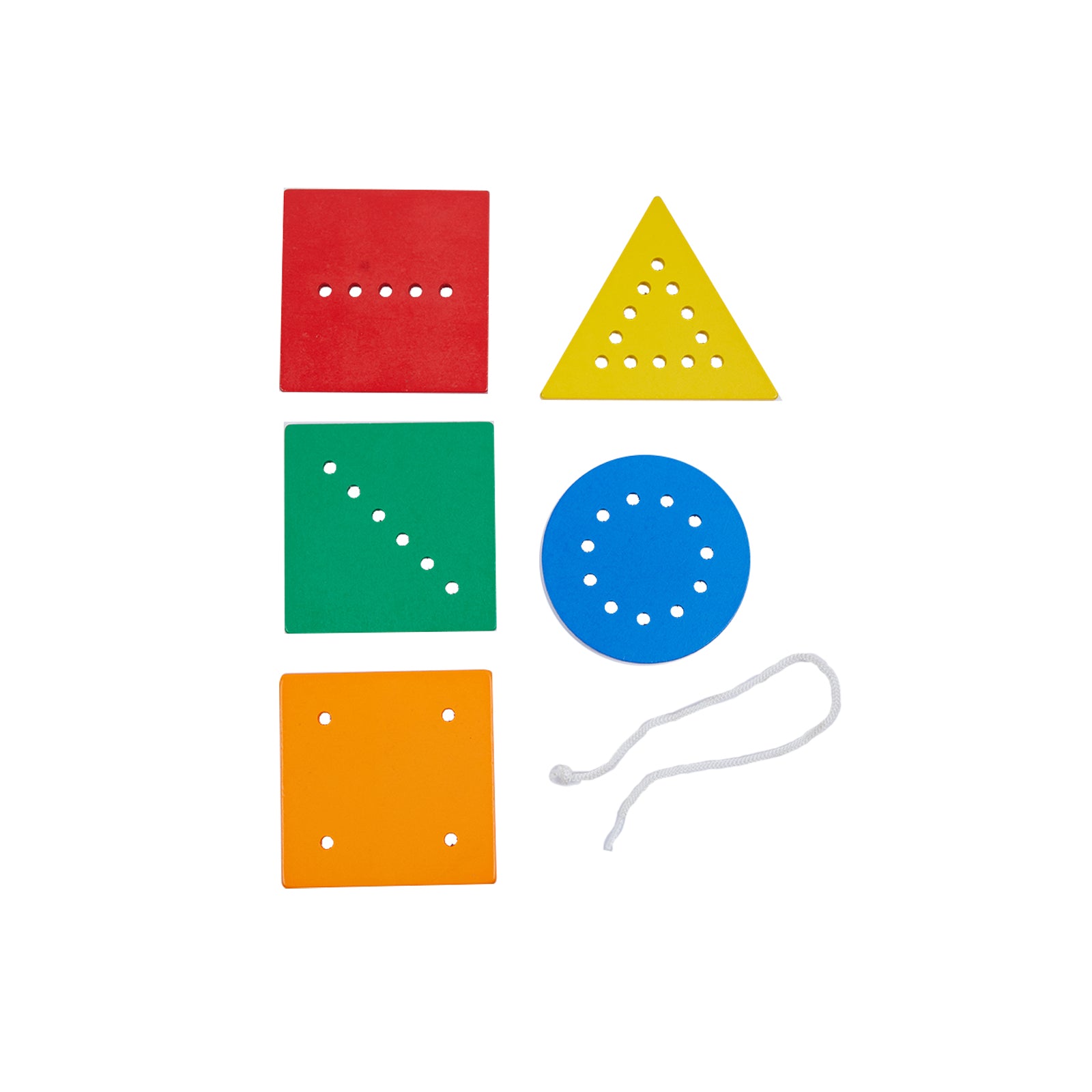 This set includes 1 yellow triangle, 1 blue circle, 3 squares with different colors and holes, and 1 white lace. Plus, it comes with a wooden tray to keep all the string toys or other wooden toys organized.